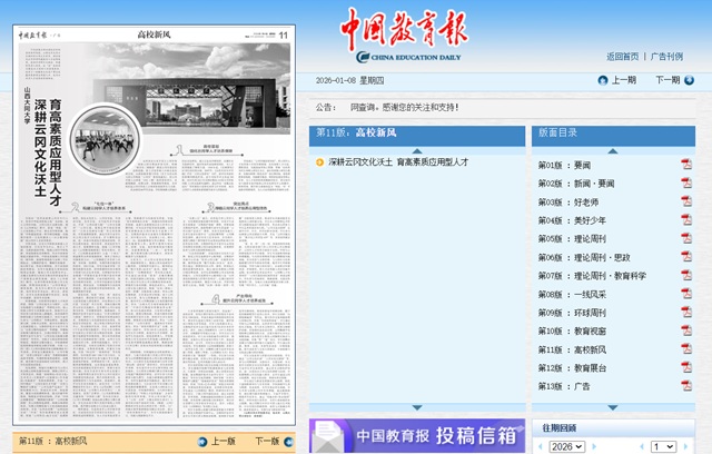 2026年1月8日,中国教育报第11版整版刊发校党委书记赵水民、校长姚丽英署名文章《山西大同大学深耕云冈文化沃土 育高素质应用型人才》,全文如下: